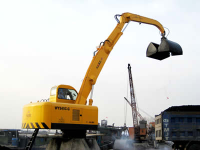 WYS42C-G型電動(dòng)液壓固定式疊臂抓料機(jī)的回轉(zhuǎn)、卷?yè)P(yáng)、變幅及抓斗開閉作業(yè)等全部采用電動(dòng)液壓驅(qū)動(dòng),先導(dǎo)控制。具有作業(yè)平穩(wěn)、各動(dòng)作可無(wú)級(jí)調(diào)速;同等作業(yè)效率下可比內(nèi)燃機(jī)驅(qū)動(dòng)節(jié)省60%能耗;司機(jī)室安裝冷暖兩用空調(diào)、多向調(diào)節(jié)座椅,作業(yè)環(huán)境舒適;配裝不同的液壓抓斗后均有自重小、抓取力大,對(duì)沙石、煤等散裝原料進(jìn)行抓取作業(yè)。 該固定式抓料機(jī)是港口、車站、碼頭等固定作業(yè)場(chǎng)所進(jìn)行散貨裝卸的最佳設(shè)備。